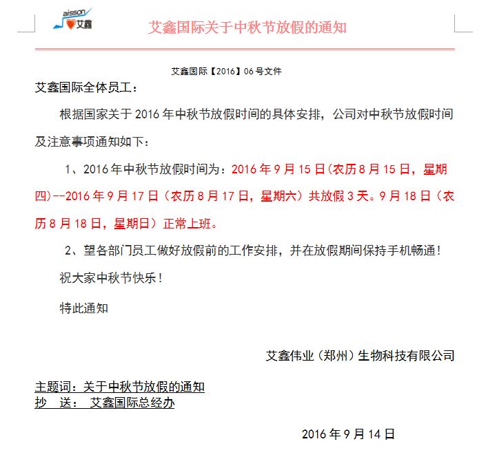 艾鑫國(guó)際關(guān)于2016年中秋節(jié)放假安排的通知